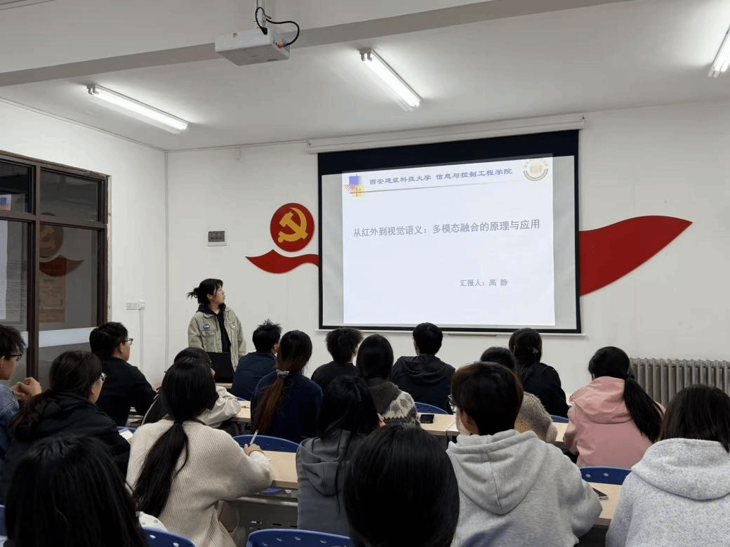 分享环节中,研究生第三党支部高静以《从红外到视觉语义:多模态融合的原理与应用》为主题,以多模态融合学术前沿为切入点,结合本科大一大二核心课程,精简剖析其与本科知识点的关联。她指出,多模态融合作为研究生热门科研方向,核心是本科《数字图像处理》《信号与系统》等课程知识点的深化与延伸——红外与视觉语义融合,离不开“图像特征提取”、“信号预处理”等基础内容,研究生科研正是在这些知识点上解决复杂难题、拓展应用场景。她结合简单案例强调,本科课程是学术前沿的“地基”,扎实掌握基础既是科研铺垫,也能通过前沿探索反哺课程理解,鼓励低年级学生从学好基础课做起,主动关联前沿、培养科研兴趣。