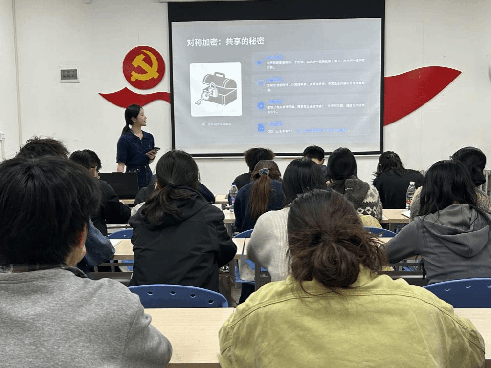 研究生第四党支部书记郭思齐以《守护数字疆域:信息安全与密码学漫谈》为主题,以信息安全与密码学的学术前沿动态为切入点,简明剖析其与本科知识体系的内在联系。她提到,信息安全与密码学作为研究生重点科研方向,离不开《离散数学》中的逻辑推演、《计算机通信网络》中的数据传输防护等基础内容,研究生的科研探索,正是在这些基础知识点的基础上,攻克复杂安全瓶颈、拓展多元应用场景。同时特别鼓励低年级学生要注重实践能力培养,课上重点聆听老师的解题思路与逻辑框架,吃透知识本质而非死记硬背,课下多投入时间练习编程,将课堂所学转化为实操能力,扎实掌握基础既是科研路上的重要铺垫,也能通过前沿探索与实践练习,反哺对课程知识的深层理解,主动关注前沿动态、培育科研兴趣。